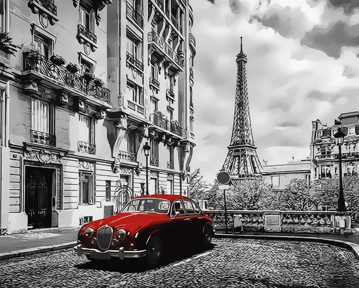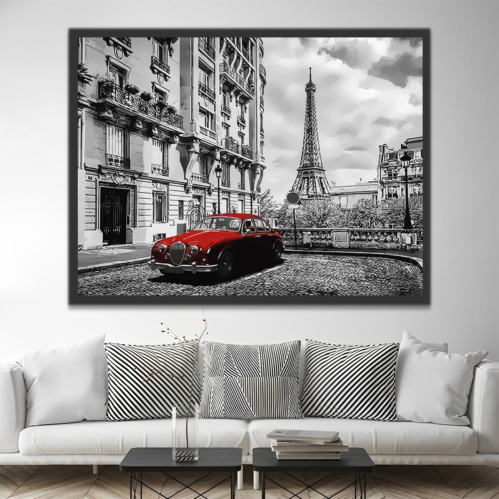 Voiture Rouge et Tour Eiffel Peinture par Numéros