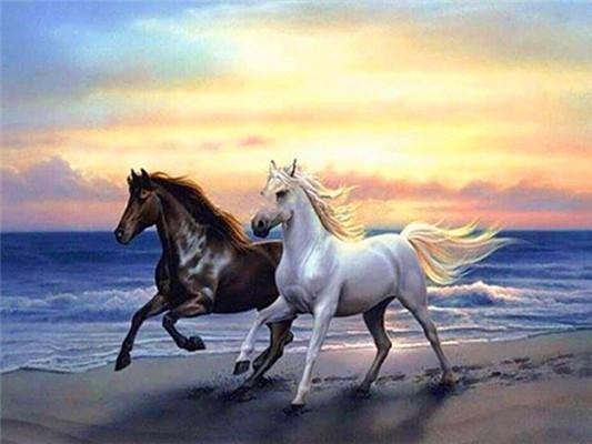 Cheval Noir et Cheval Blanc sur la Plage Peinture par Numéros