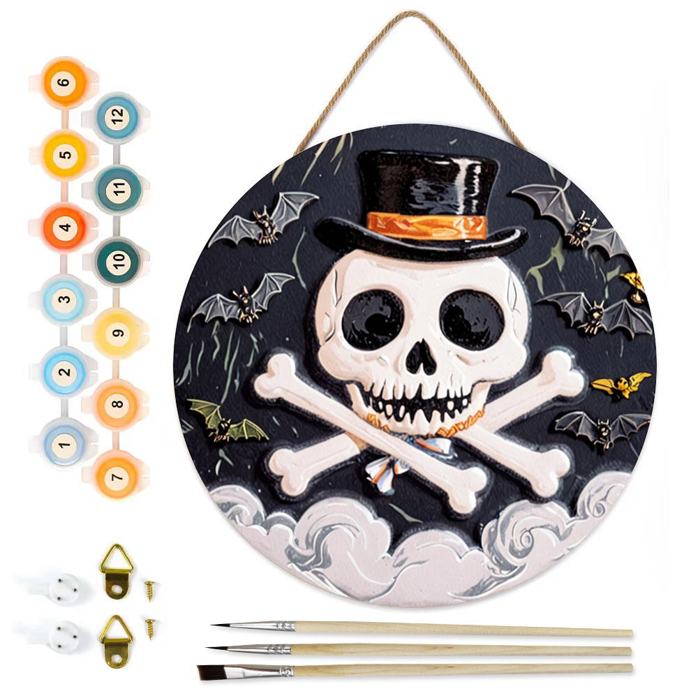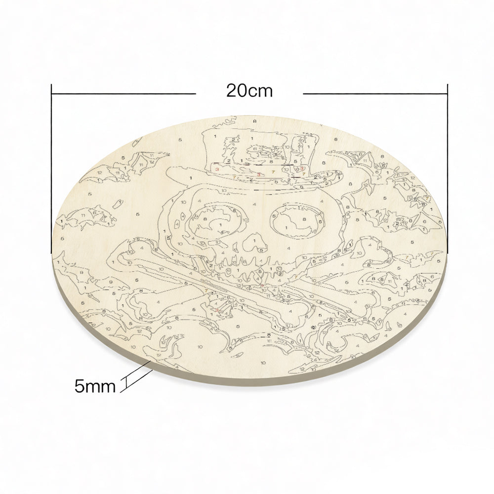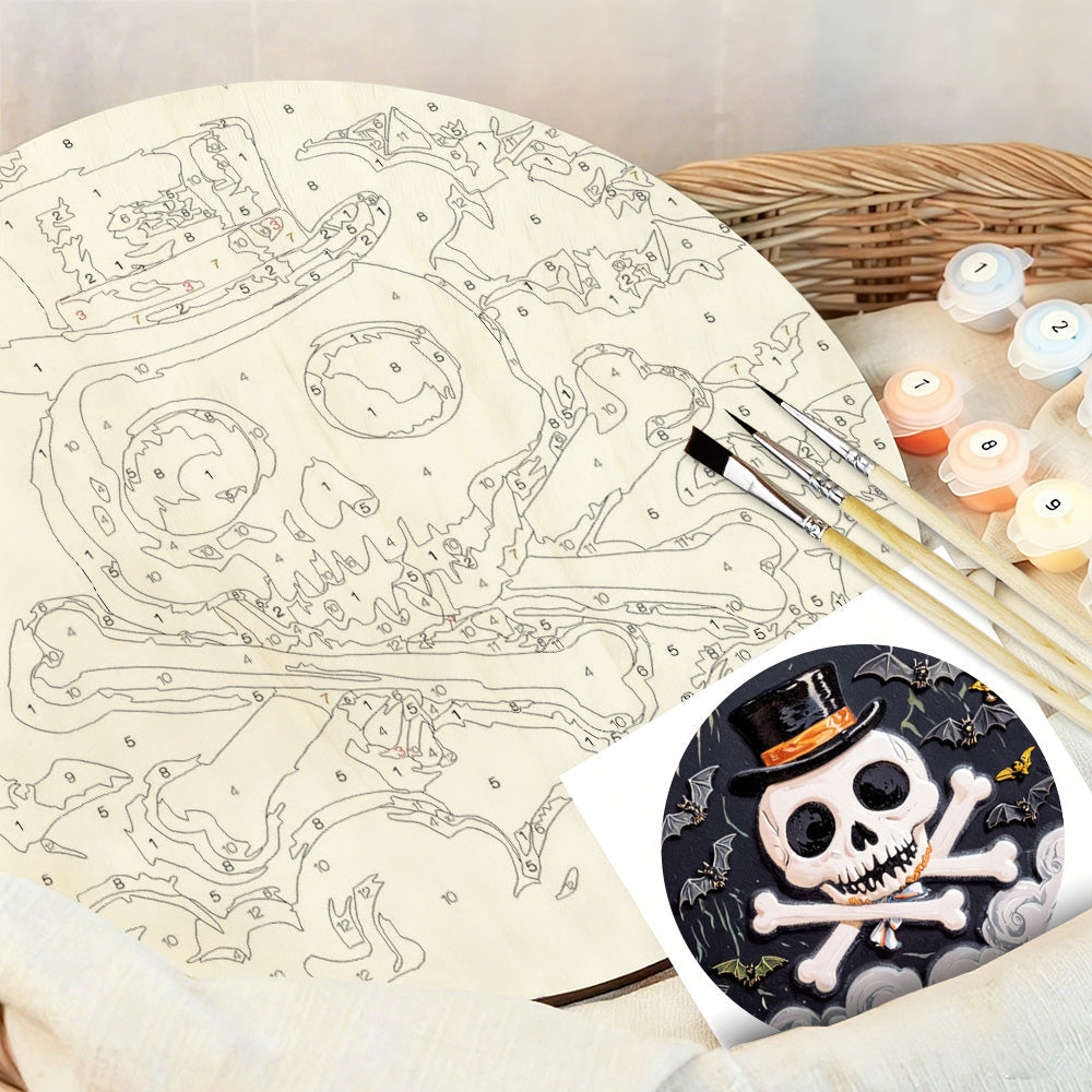 Peinture par Numéros sur Tranche de Bois - Crâne Blanc et Chauves-souris Noires