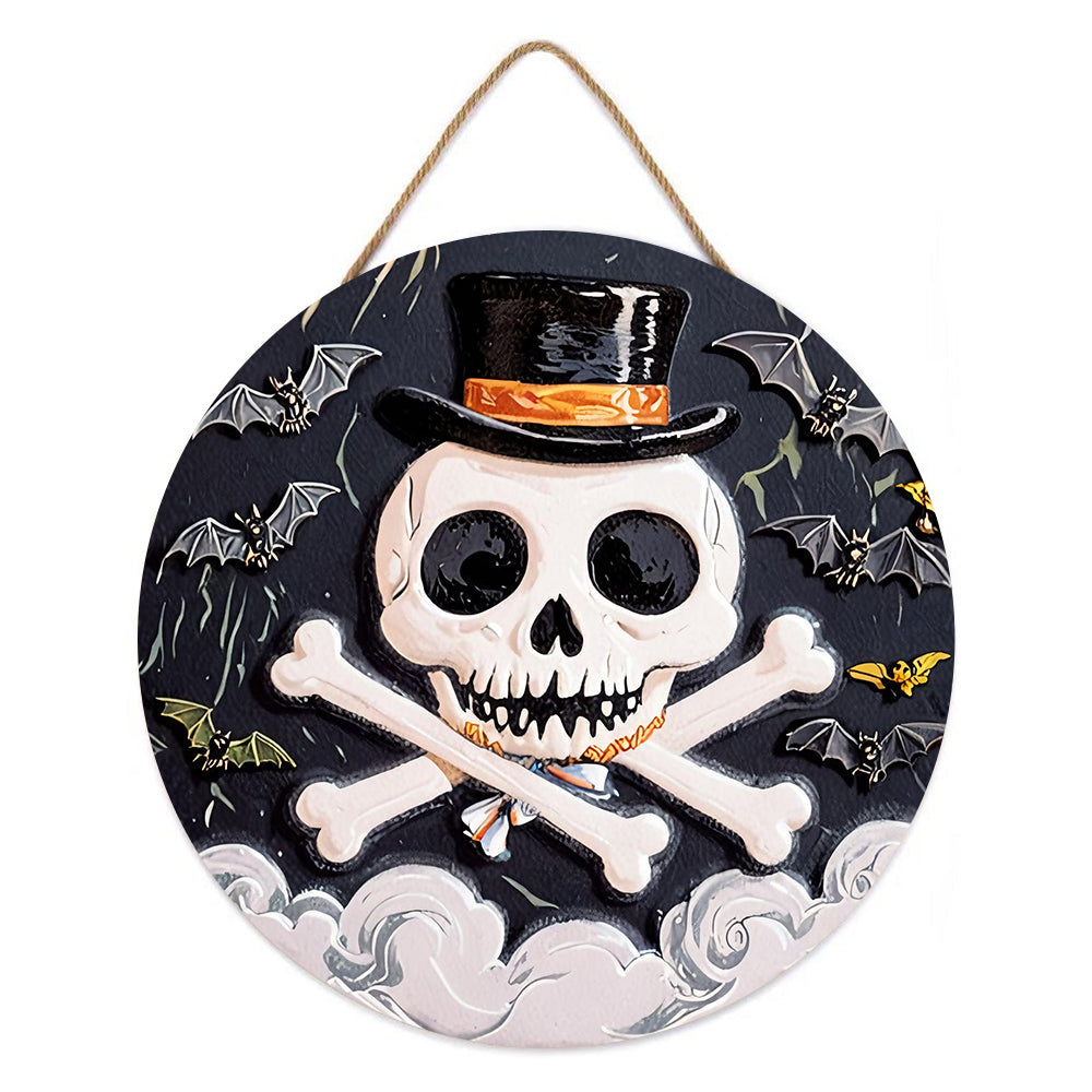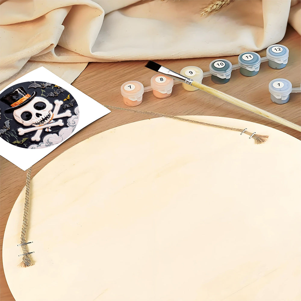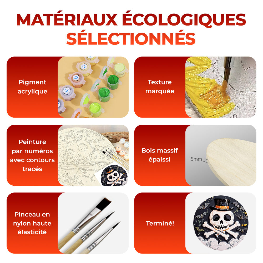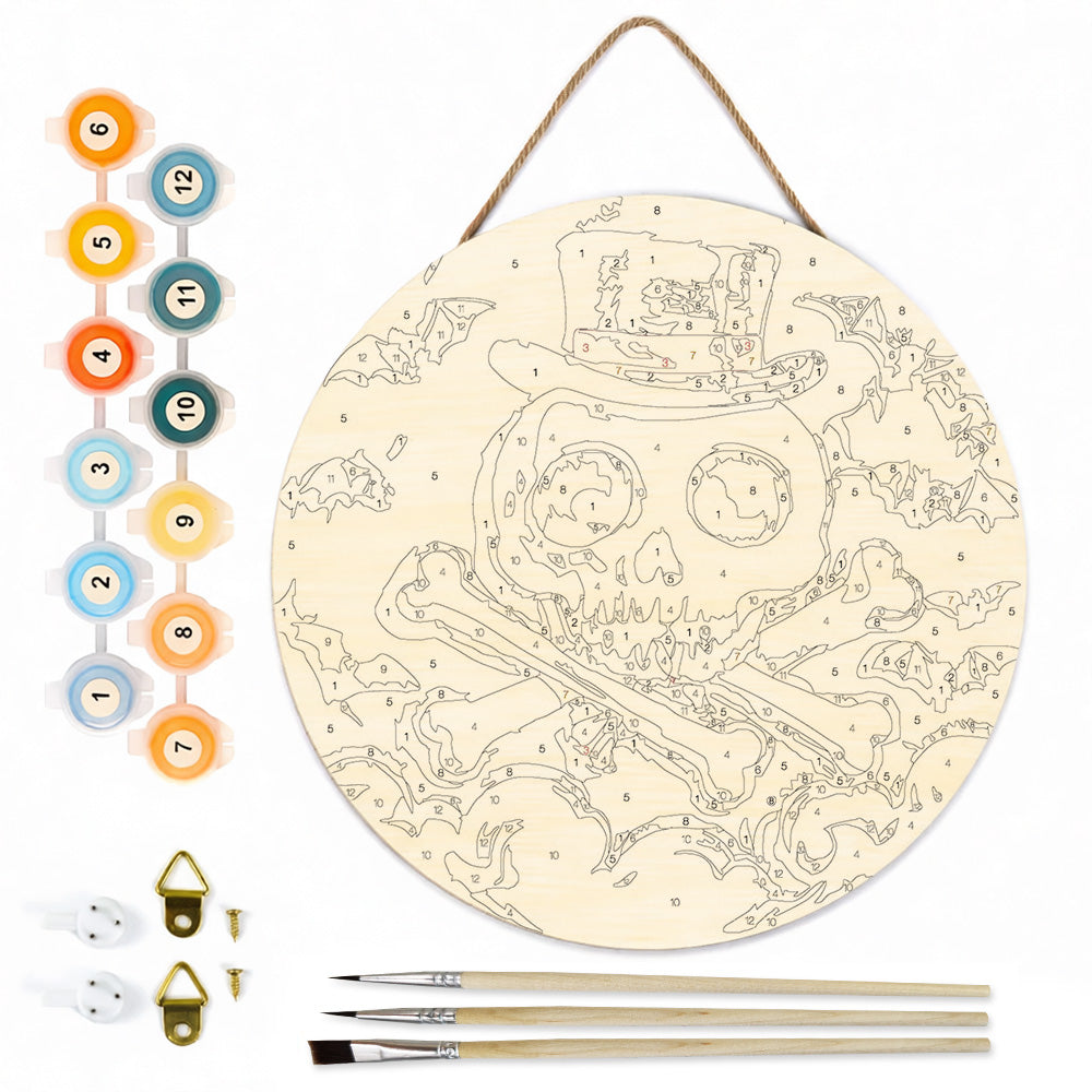 Peinture par Numéros sur Tranche de Bois - Crâne Blanc et Chauves-souris Noires