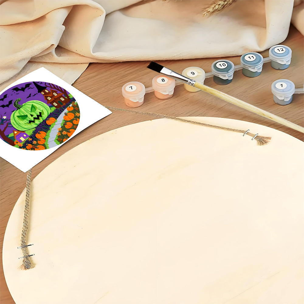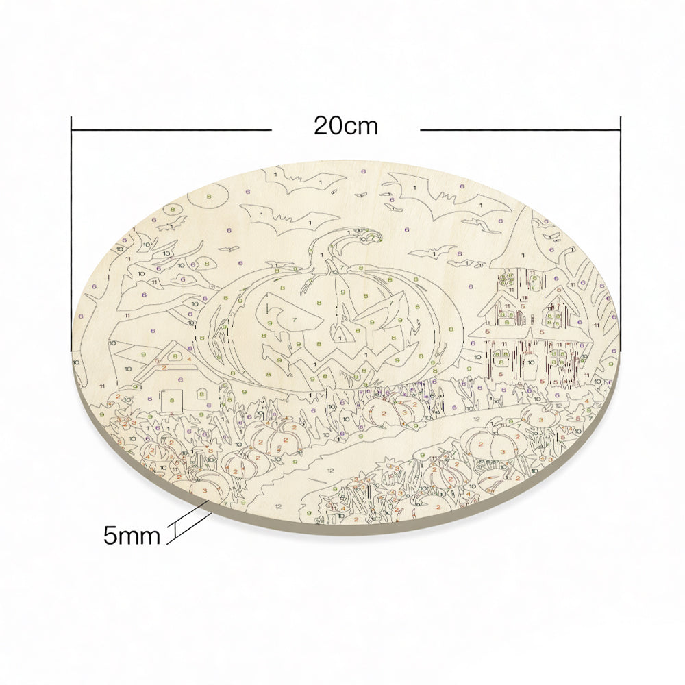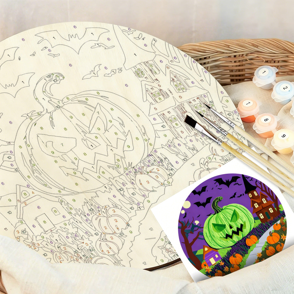 Peinture par Numéros sur Tranche de Bois - La Lanterne Citrouille Verte Terrifiante