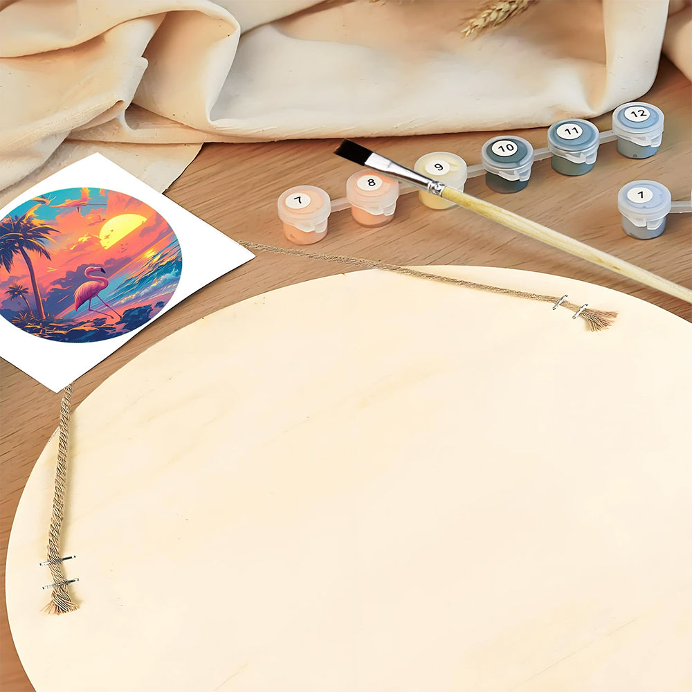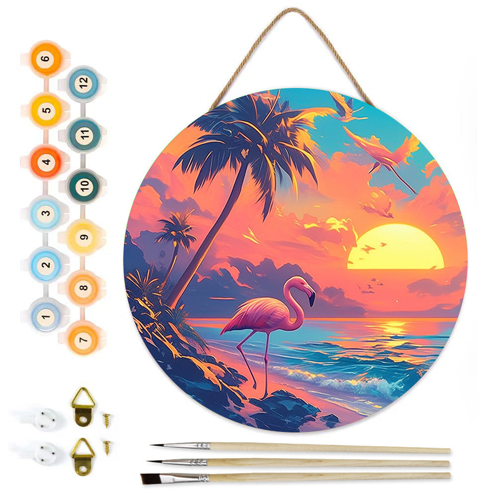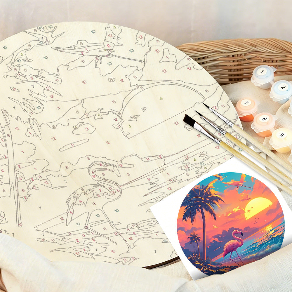 Peinture par Numéros sur Tranche de Bois - La Mer et Flamant Rose au Lever du Soleil