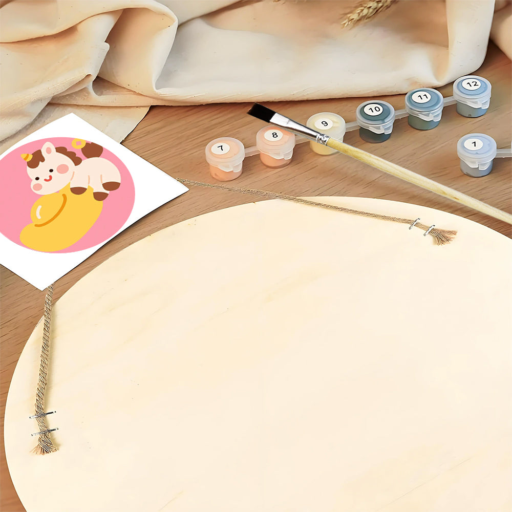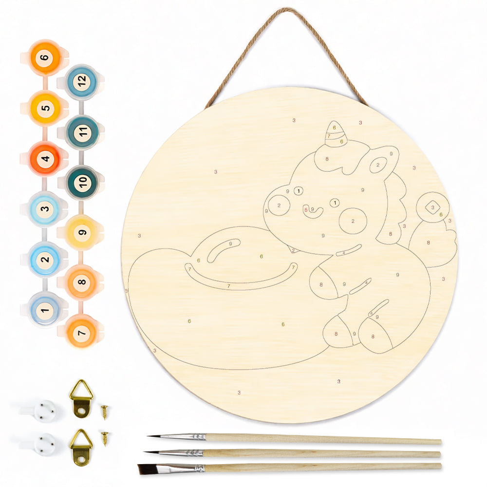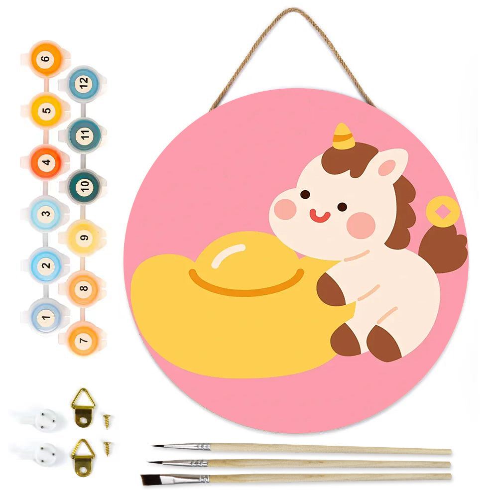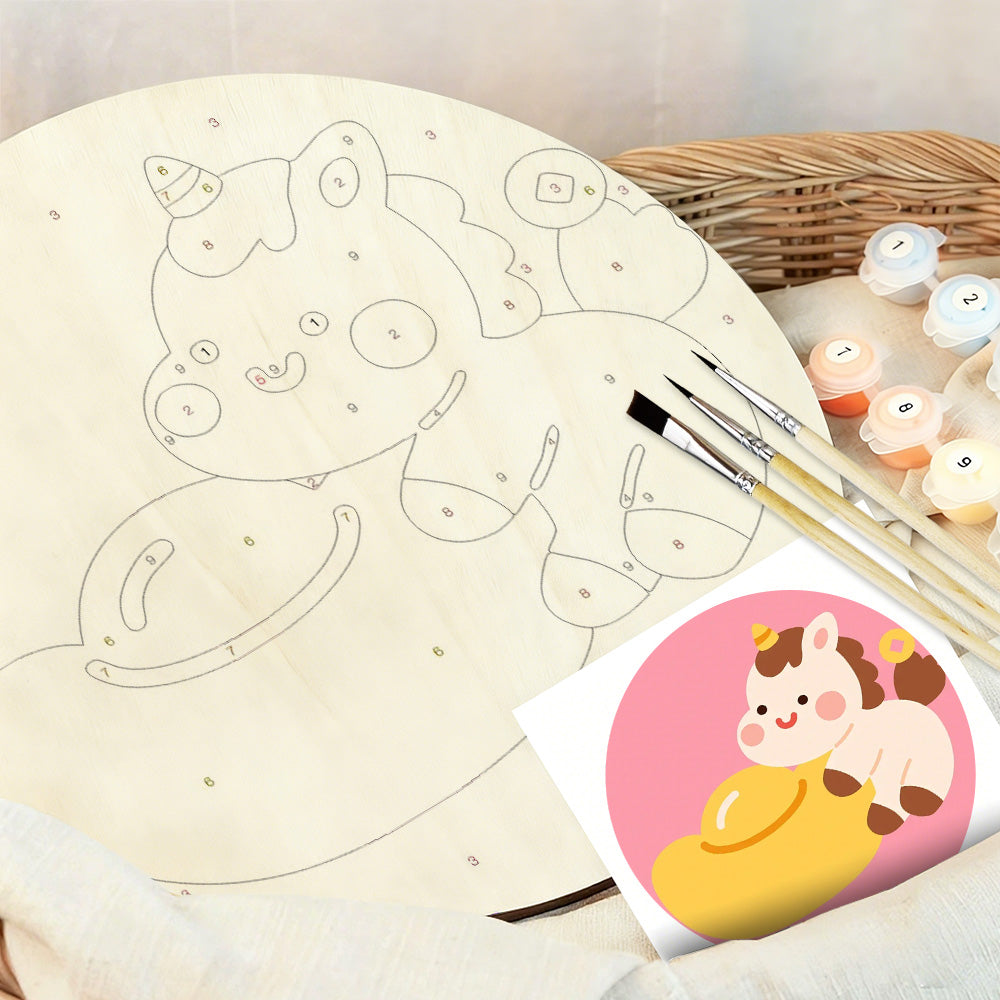 Peinture par Numéros sur Tranche de Bois - Licorne Mignonne et Lingot d'Or