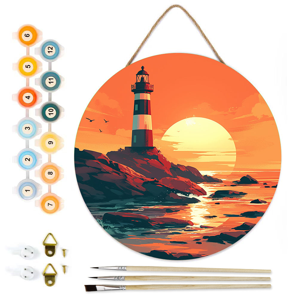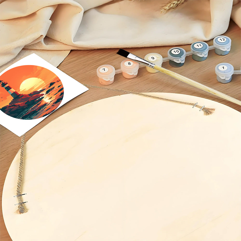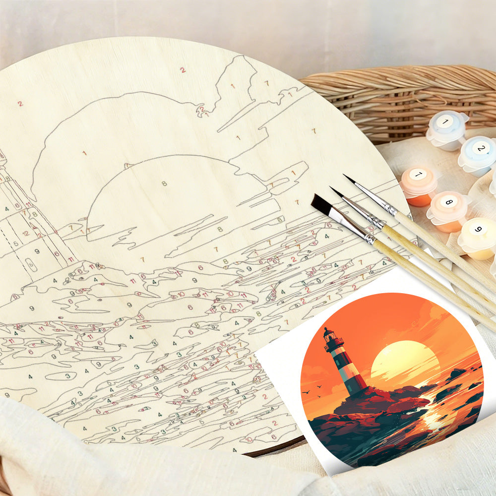 Peinture par Numéros sur Tranche de Bois - Un Phare au Coucher du Soleil